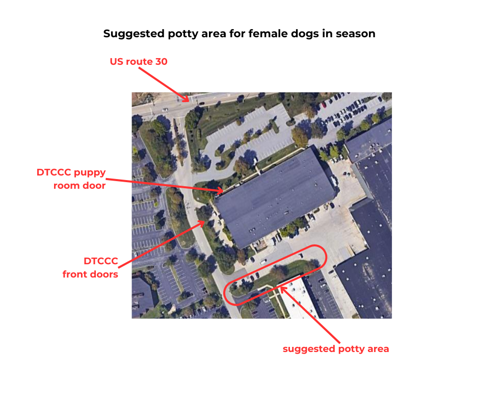 - The grassy area to the right of the building is suggested as a potty area for females dogs in season (see map).